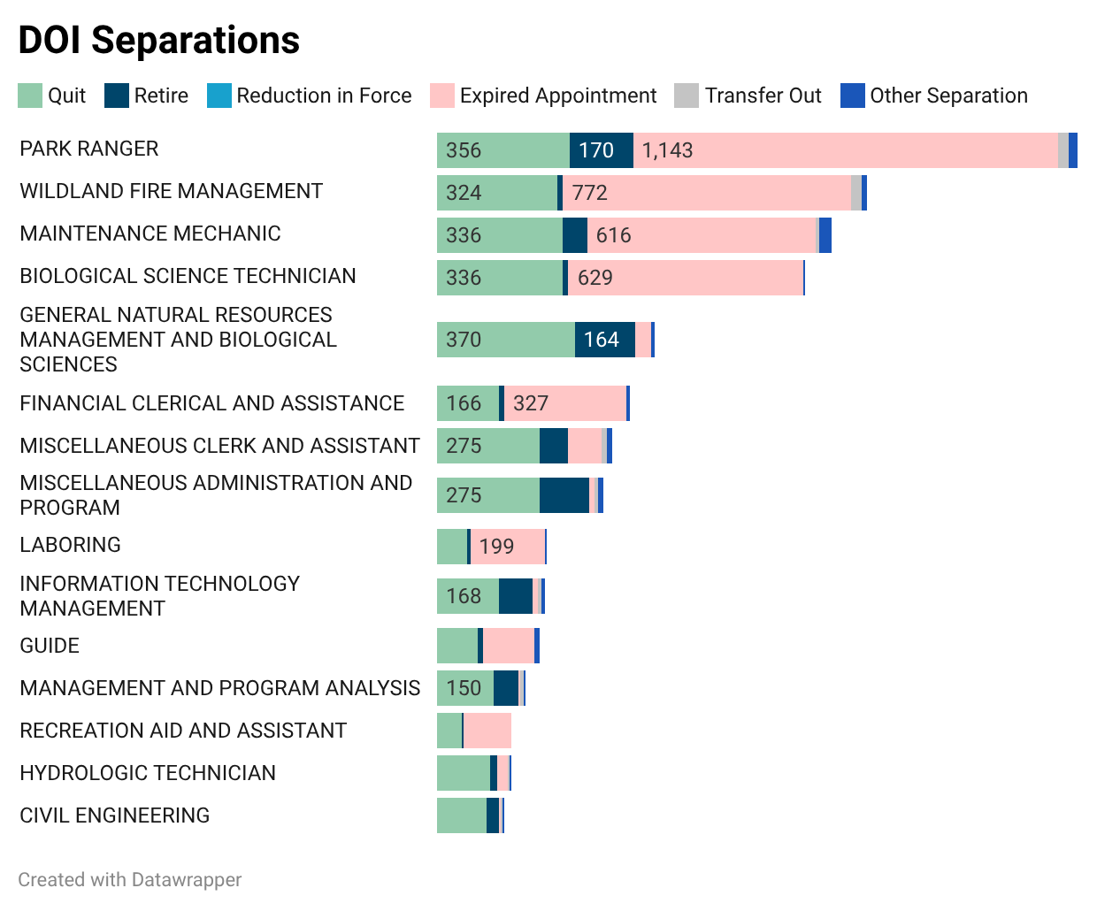 In the Great Lakes region, DOI separated from 231 employees, including 104 from FWS. Although the region accounted for only 8.2 percent of DOI employees in 2024, it employed a disproportionately high share of FWS staff, nearly 14 percent. In October 2025, the President issued an executive order that continued the trend of restricting federal hiring. According to OPM’s federal recruitment numbers, only one job in FWS has been posted in the Great Lakes region since.