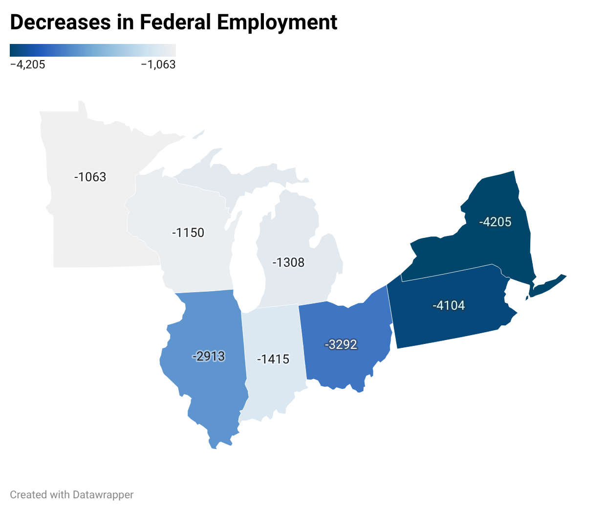 Since January 20, 2025, the Trump administration has initiated a broad effort to reduce the size of the federal bureaucracy. Federal employment has dropped by 219,922 positions over the last 12 months. Actions taken by the administration include layoffs of probationary employees, reduction in force (RIF) notices, and the deferred retirement program. The Great Lakes region alone between the end of 2024 and the end of 2025 lost an estimated 19,450 federal jobs.